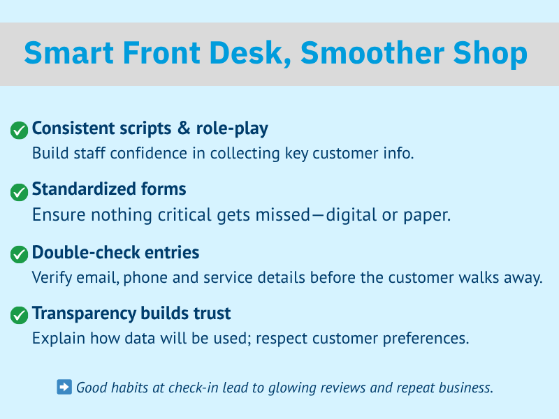Start strong and everything runs better. When shops prioritize accurate information at check-in, the rest of the process—service, scheduling, communication and retention—flows more smoothly. From faster workflows to more effective marketing, it all starts with a moment that’s easy to overlook.