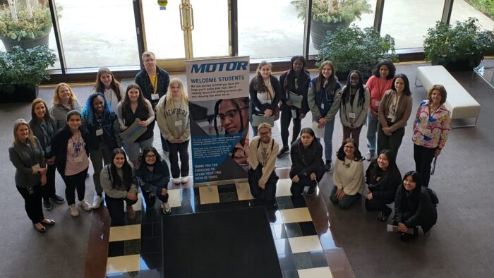 After establishing a partnership with MCWT last year, MOTOR was excited for the chance to host an event for the GET-IT Program. A group of 18 students from Walled Lake Western High School visited MOTOR, with transportation provided by MCWT. The young women are all part of their school’s MCWT club, which is led by their Computer Science teacher, who accompanied them during the visit. Upon their arrival, they were welcomed into the building and directed to MOTOR’s suite of offices.